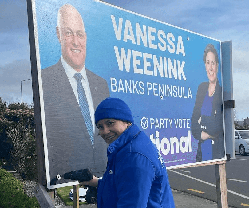 National’s Banks Peninsula presumptive MP Vanessa Weenink (it’s possible the special votes could change her 83-vote majority later in the week), said that apart from 30 signs that were stolen or removed, 280 of hers were destined to become fence posts.