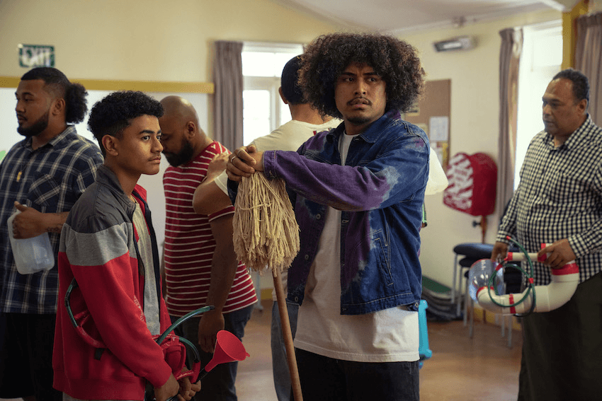 Looking around, it’s clear that the restaurant we’re sitting in is an expression of that energy. So too, are the familiar sights of homes or cars in Aotearoa ablaze with Tongan flags, just like that in the film. It lies behind the success of the Tongan rugby team against France in the 2011 Rugby World Cup, despite comparatively limited resources. That fueled the 2017 protests by Tongan league fans in Tāmaki Makaurau. It’s that feeling that propels the characters in the film to form a brass band – against all odds. It’s how Foliaki ended up with the role in the film too.
