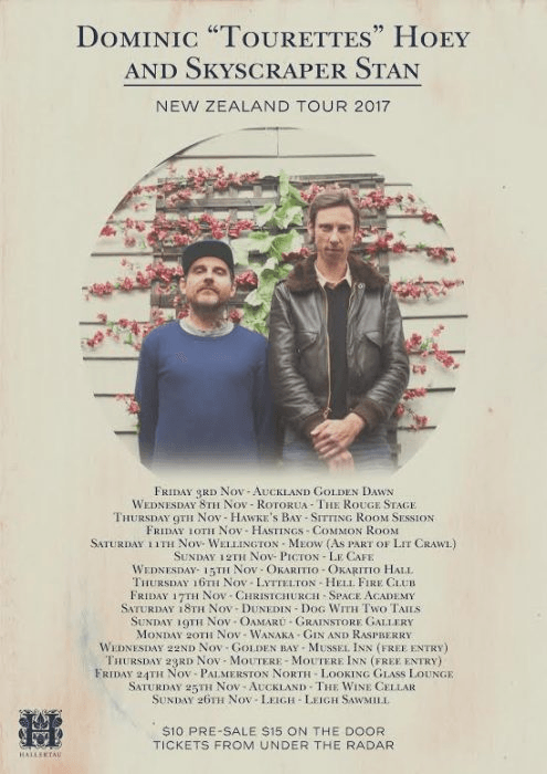 Dominic Hoey (aka Tourettes) used to tour New Zealand as a rapper and, before that, as a drummer in punk bands. This November he and singer-songwriter Skyscraper Stan are playing 17 towns around New Zealand and Hoey will be reporting from the road for The Spinoff – a sort of state of the nation through the eyes of a poet and a folk singer. Here, Hoey introduces the project.