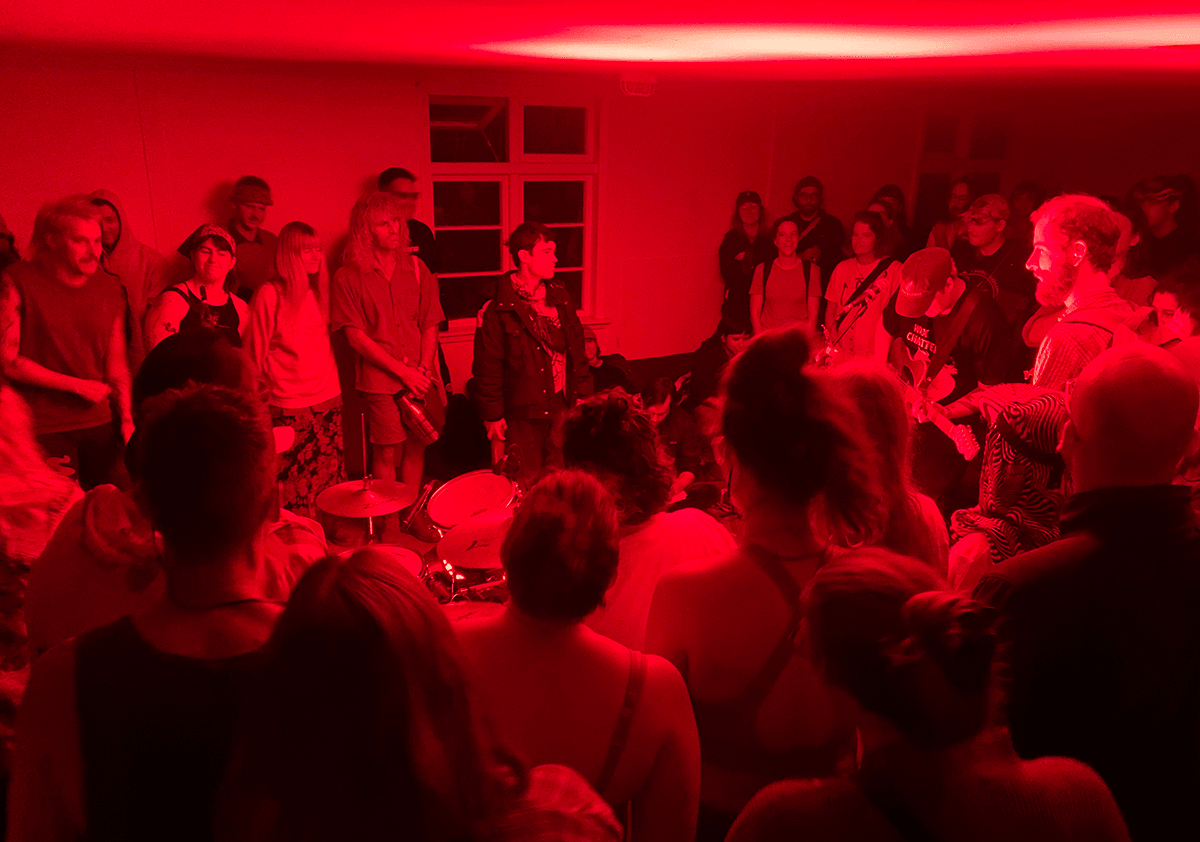 The baby, with downy golden hair crowned by a pair of fluoro earmuffs, looked like she suddenly understood the meaning of life. Perched on her mum’s hip, her eyes were trained on the lead singer of Splinter, an experimental metal band from Ōtepoti, who was crouching on the ground screaming. The bassist and guitarist stood in wide stances, headbanging, and the drummer’s long hair was getting tangled in her own earmuffs.