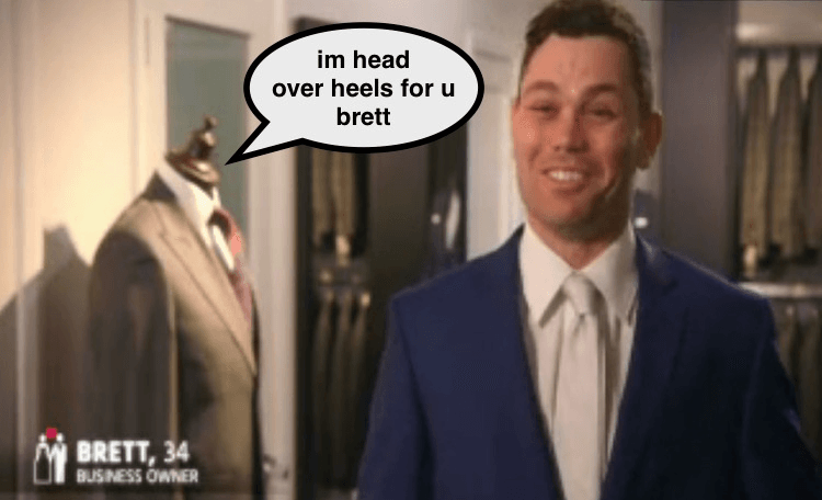 Angel’s perfect match Brett has all the signs of a top bloke, by which I mean he literally makes wooden signs in his shed for a living. He’s a true and pure sweetheart who loves cross-fit, “hitting up the emails” and even sent her a bracelet and flowers before they met. Take my heart. TAKE IT.