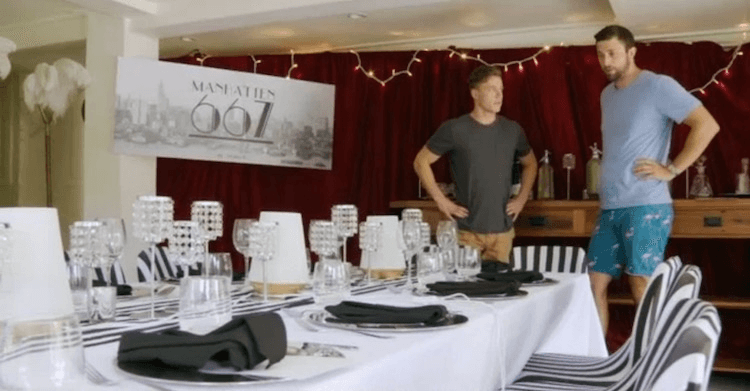 Proprietors Jaryd and Ben are MKRNZ’s ‘childhood buddies’, who met when they were five and have played soccer together ever since. Now, decades later, they have knocked together a Prohibition-era New York-themed restaurant in one of their parents’ houses, with black-and-white striped upholstery, fancy feather things and bejewelled table settings. It is here they will host celebrity chef judges Pete Evans and Manu Feildel, along with ten of their TV cooking competition peers.
