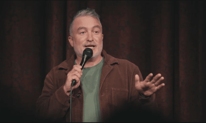 He’s also deadset on picking the bone clean in extracting as much humour from his situation as possible. He tells a group of gathered oncology specialists that he has managed to successfully crack the same joke about getting a penis reduction done five out of six times before going under the knife. Throughout the episode, we see snippets of him performing a gig at The Patriot in Devonport, Auckland. He talks about being inside an MRI machine and noting the warnings about radiation. “Is it safe?” he asks the technician. He is reassured it is as she dons “a full fucken lead suit and goes to Timaru to push the start button”.