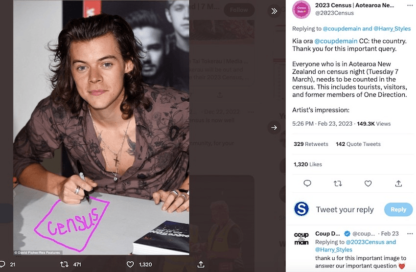 Last week, music magazine Coup De Main asked a question into the ether that sent both star spotters and statistics stans into a frenzy. “Important question for 2023 Census,” the post began, “will Harry Styles also have to do the census on March 7th with the rest of New Zealand?”. Census NZ was quick to reply, making headlines across the mediasphere: “Everyone who is in Aotearoa New Zealand on census night, needs to be counted in the 2023 Census,” they wrote.