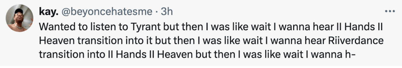 Not only is this album a musical journey; it’s a history lesson of Black music and her family heritage (B-E-Y-I-N-C-E), seamlessly interwoven with her unique take on country music. Every beat, reference, interpolation, and collaborator has been intentionally chosen, reminiscent of her approach in ACT I. It has come to the point where I don’t want or need to explain why Beyonce is so amazing at what she does. If you don’t get it, you never will.