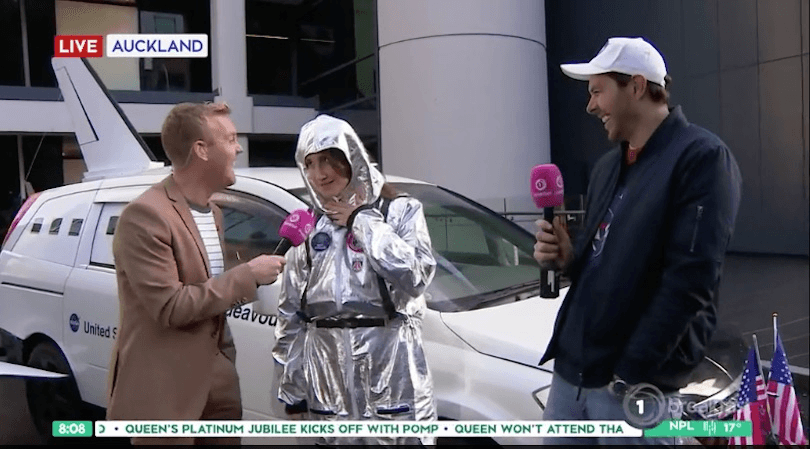After eight o’clock, Breakfast seemed more at ease as it left heavier issues behind, focusing instead on beer tasting and cars that look like rockets. Matty interviewed ZM’s Bree and Clint, the proud new owners of a unique space rocket vehicle. “I was never able to afford a house in Auckland anyway,” said Bree, who’s an astronaut now. They’ve planned a rocket road trip around Aotearoa. “I want to go to Mars, he’s more of a Uranus man,” Bree said of Clint. “You and me both, Clint,” Matty replied.