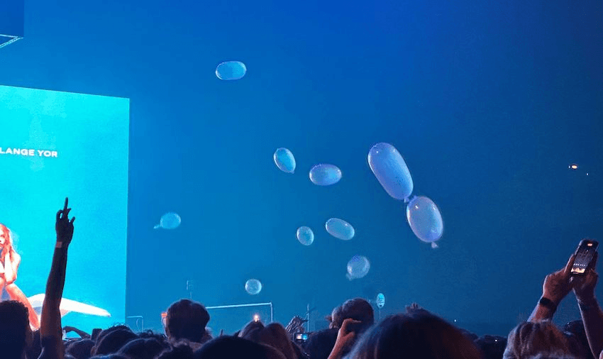 Despite the polite smiles, it wasn’t long before those very same condoms were being inflated, tied off and batted through the crowd of girls and gays. Again, Coldplay wishes. As the lights flushed deep blue and a rumbling synth built towards the arrival of Australian’s biggest pop superstar of the moment, the teen girls behind me were extremely under the pump trying to get their overinflated condom balloon airborne. “It’s huge,” one shrieked. “I can’t do it, it’s so big!!”