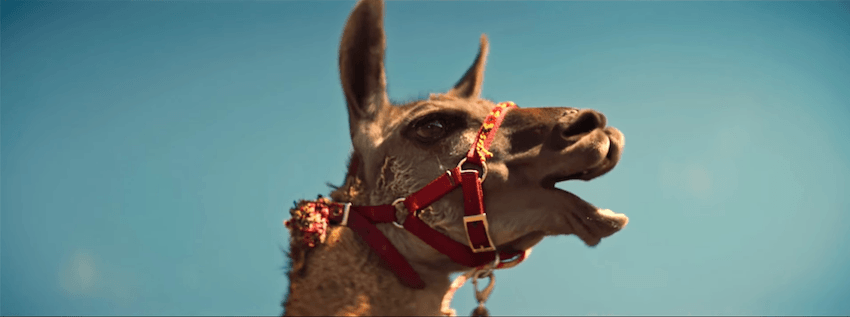 0:10 – He crawls hungrily/thirstily across the desert (beach) towards a woman and a llama. Fun fact: llamas do not live in deserts, or on beaches. This woman is shortly revealed to be…