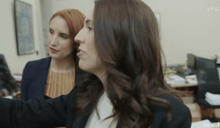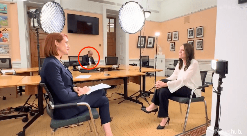 When they weren’t sitting down, cameras captured Hayes and Ardern fossicking about in her office, which made for dynamic and captivating scenes. Also appreciated this classic “behind the curtain” moment towards the end. Thoughts and prayers to this man: