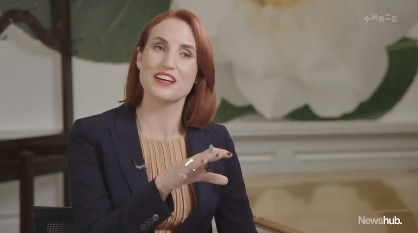 Newshub: Much lighter and more optimistic palette, complete with some beautiful wall art behind both of our subjects. Hayes positioned herself in front of what looks to be a giant lily pad printed on the wall, whereas Ardern’s backdrop was a light peachy wall with grey accents, adorned with a colourful painting depicting what this scientist can only describe as figures.