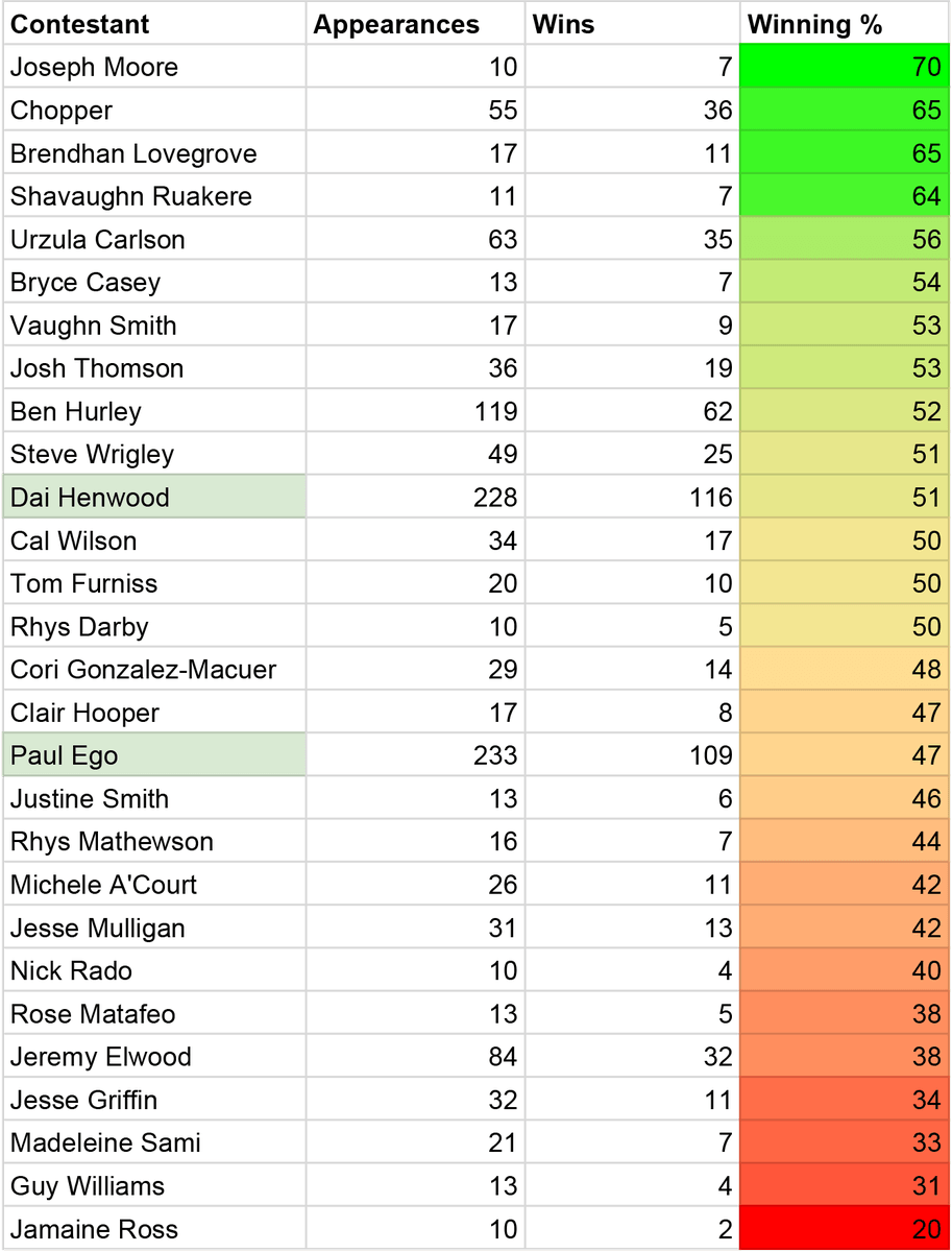 In the above tally of all the regular panellists, 1032 of the appearances have been by men and just 198 have been by women – and that’s not even accounting for the permanent fixture of host Jeremy Corbett. Team captain Paul Ego alone has appeared in 233 episodes – that’s 35 more episodes than all of the women panellists combined, and 3.7 times as many total episodes as the highest appearing woman (Urzila Carlson at 63 episodes).
