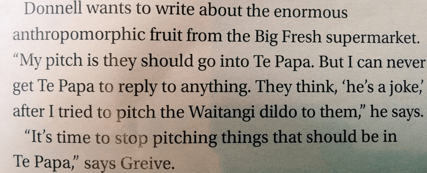 Get It to Te Papa began in great and abiding failure. It was a few months after the Waitangi Dildo had been flung, hitting Steven Joyce’s cheek and exploding into our national consciousness. I was at a morning news meeting at The Spinoff and a thought hit me. It was the closest I’d ever come to a Eureka moment – like a key clicking in a lock inside my brain. The world exploded into a kaleidoscope of different hues. In an instant I knew: the dildo should be tracked down and placed in Te Papa.