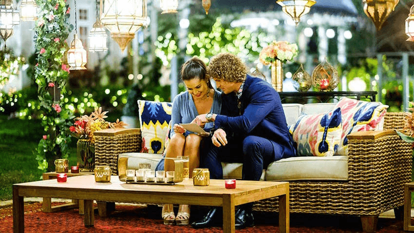 Back at the mansion, the girls agree it will only be serious chats tonight. Cass however has got the help of this season’s famous couch-decorating crew and sets up a Hawaiian ukulele station outside. She invites Nick out and they make up songs for each other which are about as creative as the naming of Bear the Polar Bear.