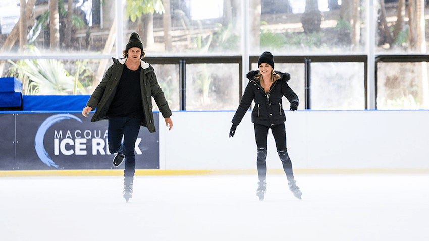 Sophie greets Nick at the ice rink for her prize final date. Ice skating was her “Thursday sport” in high school so she knows her way around the rink, although not quite pulling off a triple axle.