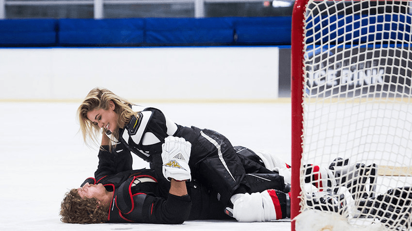 They kit up in ice hockey gear, where Nick challenges her to a “first to score three” game. If she wins she gets a surprise, and if he wins he gets to smooch her in the goal. The score equalises with a two-all draw, but Sophie happily loses, being rewarded not only with a smooch in the net but a giant polar bear soft toy. Nick creatively names it Bear.