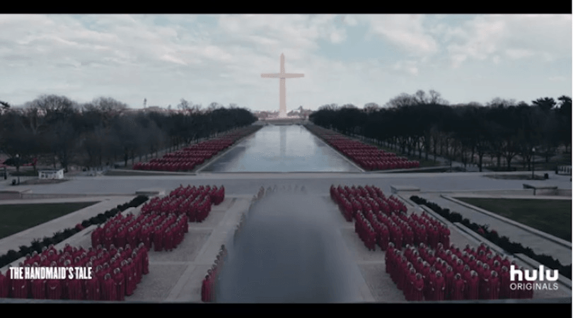 Is this the beginning of the end? Handmaids march through the streets of Gilead and over bridges, standing in formation at the Washington Memorial. We see a frantic Emily holding June’s baby, and a resolute June. The Commander has another tantrum. Did he vote Reagan? Does he love big rugs, too? It’s all his fault.