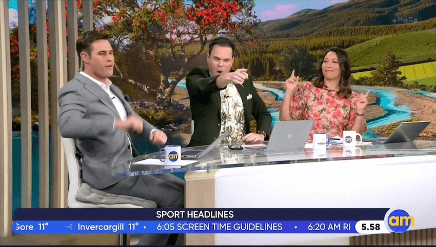 As the sun rose across the motu, former AM show presenters Amanda Gillies and Ryan Bridge popped by to reminisce. “My heart breaks today, because I know so many people want it to continue. It’s been a wild ride,” Gillies said, who spent the last 23 years at Three. Bridge revealed he only got a job on TV once he got his terrible teeth fixed, and then dropped the bombshell that former AM Show presenter Mark Richardson now takes a bus to his new corporate job. “He doesn’t want to pay for parking,” Gillies confirmed.