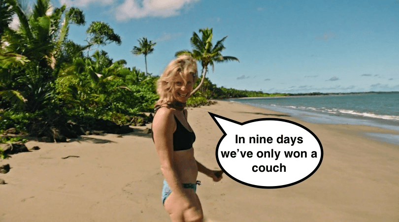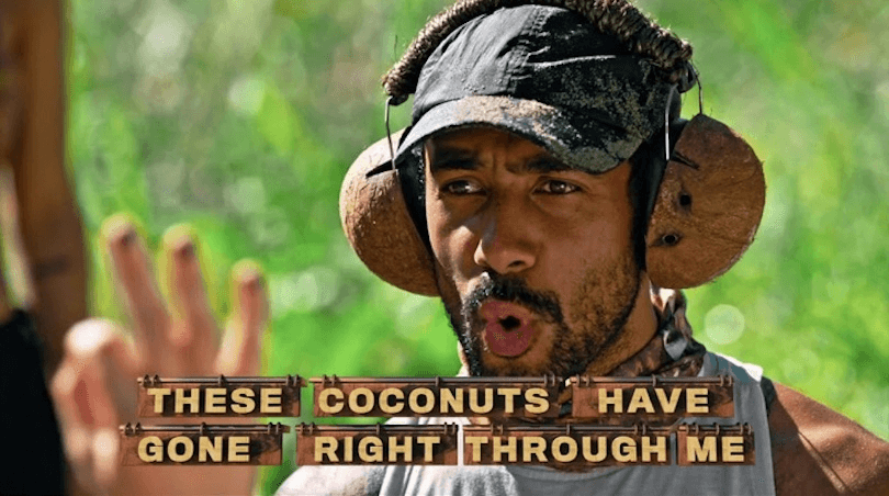 It breaks my sweaty troppo heart to put Matty here, because the poor lamb spent the week in a rabid state of frustration at being stuck with a bunch of numpties who’d rather chuck knives at trees than talk strategy. Barb announced he couldn’t be captain because he didn’t play sports, and things got so dire that Matty took one for the team by getting knocked in his own lovely bunch of coconuts.