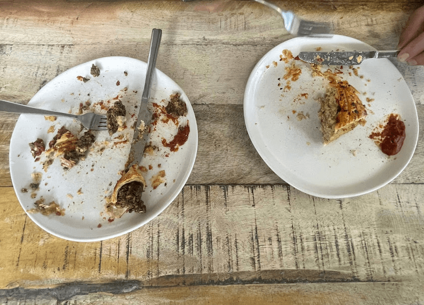 Though the conversation is chill, the pair have one pet peeve: waiting too long for their meal. For lunch they each order a sausage roll. Colin chooses classic beef, while Manu opts for pork. The tension simmers as their food takes progressively longer to arrive. Twenty-five minutes after ordering, and less than five minutes before they have to be ferried away to their next appointment, Colin finally addresses the elephant-sized sausage roll in the room: “How long does it take to make a sausage roll?” he wonders. Manu adds: “They’re baking to order. Why? It’s lunchtime.”