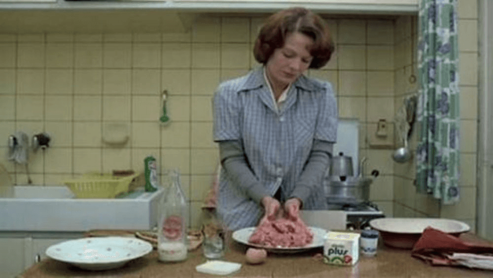 Jeanne Dielman isn’t that. It’s Belgian, three and a half hours long, and hard work. Akerman’s camera mostly stays at eye level, fixed in place as characters wander in and out of scenes which occur in real time, often without dialogue. Nobody ever really explains their actions. The film’s signature set piece is four uninterrupted minutes of its protagonist silently coating veal cutlets in egg, flour and breadcrumbs – plus wiping up afterwards.