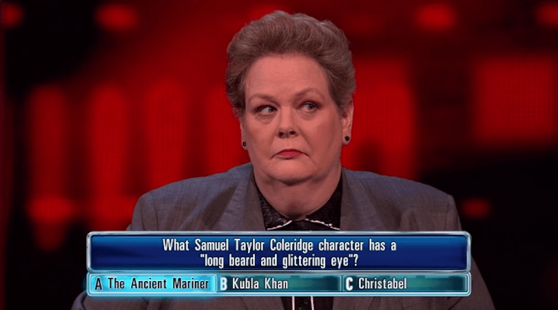 The Governess’s eyes are like quizball lasers that penetrate deep into the soul, reducing the contestants to a noble gas that’s either a) helium b) nitrogen or c) tungsten hexafluoride. Watch them nearly roll out of her head as she looks skyward, seaward, through time and into galaxies far, far away in the hope of escaping whatever celebrity ignoramus she’s facing.