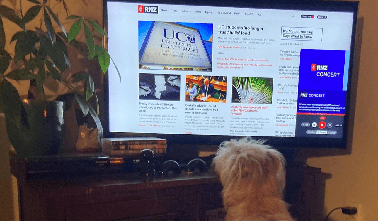 We tuned in just as Greensleeves started to play, and by the end of the song both myself and my partner felt ready for bed. August, our Cavalier King Charles puppy, seemed pretty chill too. He curled up on his bed and listened for about an hour, emitting only the occasional guttural growl as our neighbours decided it was time to let off several extremely loud fireworks. Not sure the applause at the end of some of the music was helpful, though the soothing voice of the RNZ Concert host – and her request for animal-related music puns – was as relaxing as the music. Again, this may be more a reflection on my own lack of sleep rather than August’s. / Stewart Sowman-Lund