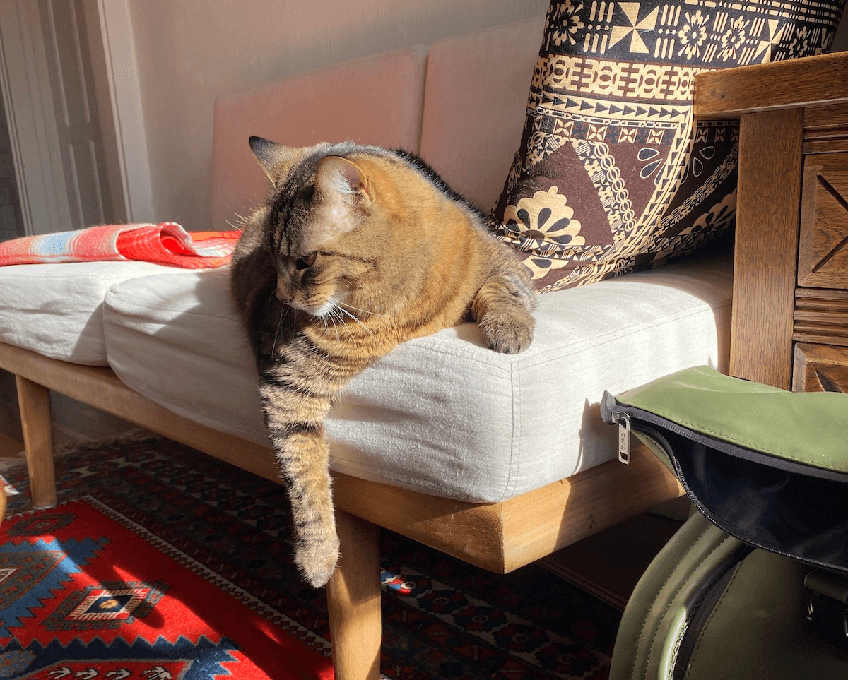 We tuned in to hear an aptly-named composition called ‘Twilight’ just as fireworks started popping off across south Christchurch. Maggie had started to burrow into me, flinching and flitting her eyes about a bit, and the music actually kinda… worked? Within a few minutes she was back down on her favourite rug happily chewing her fake fish bone thing, and at one point she even went up to the TV and rested her head on the cabinet to really soak up the vibes. Might have just been trying to read more about the ancient, inconspicuous plant voted new Zealand’s favourite, but who can blame her? Link the cat stayed tucked up in a ball inside Maggie’s crate (power move), completely unbothered by anyone and anything around him. / Alex Casey