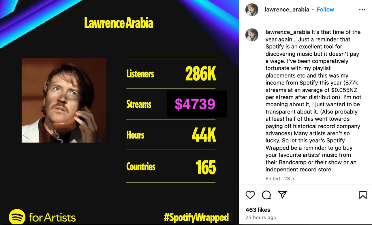 Local musician James Milne, aka Lawrence Arabia, shared the reality of streaming revenue on his Instagram yesterday: “just a reminder that Spotify is an excellent tool for discovering new music but it doesn’t pay a wage.” Sharing his own Spotify Wrapped data, he revealed that having 877,000 streams, totalling over 44,000 hours, resulted in a total of $4739 income for 2024. “I’m not moaning about it, I just want to be transparent about it,” he wrote. “Many artists aren’t so lucky.”