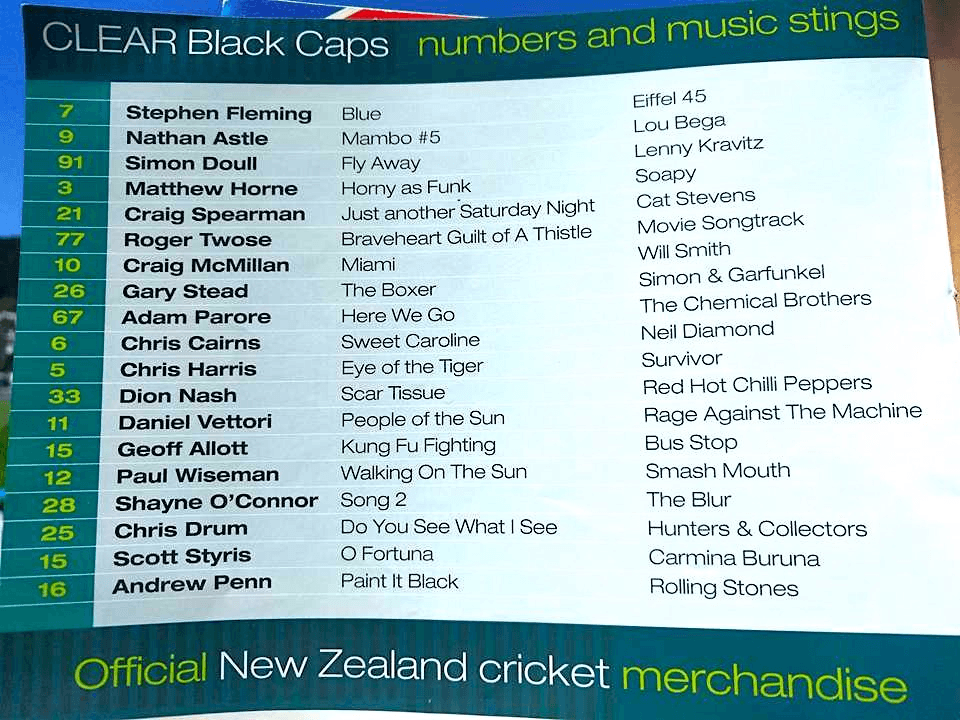 On the 12th of January 1999, on the grassy banks of McLean Park, accompanied by my dutiful older sister, I saw my first ever live international cricket game: New Zealand vs India. Not only did I get to see my cricketing heroes and legends of the games in the flesh – the likes of Sachin Tendulkar, Rahul Dravid and Matthew Horne (with his distinctive but technically unsound head nodding pre-movement) but I also got a memento – the match programme. In it was the CLEAR © Black Caps team list, each player listed with their playing number and, most crucially, their music ‘sting’ which would accompany their entrance to the batting crease.