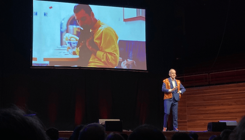 Here’s something I never could have predicted in the Grand Design of my own life: today I woke up with a Kevin McCloud-induced hangover. Last night the Grand Designs host stormed the Town Hall in Ōtautahi as part of his Home Truths tour and delivered a frenetic and far-reaching three hours of clips, costumes, quizzes, lectures, bejeweled safety vests, gags, questions, answers and, for some reason, a demonstration of how to tie a bowtie in under 60 seconds.