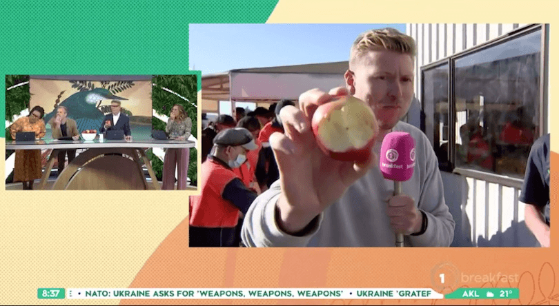 On an already upsetting day, the shocking news that we’ve been eating apples wrong could have easily tipped us over the edge. That’s what Matt Gibb told us when he beamed in live from a Hawke’s Bay apple processing plant that handles three million apples a day. The trick, apparently, is to “bite from the bottom”, which eliminates the issue of the core.