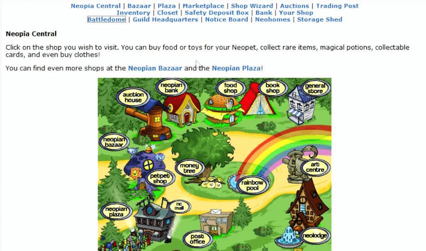 Neopets was shaping us as consumers, but also as the staunch lil’ capitalists of tomorrow – because, not only could you buy and sell these items in a free-trade marketplace, but you could then invest that in-game revenue in virtual stocks of thirty Neopian companies. Neopet’s executive vice president in 2004, Rik Kinney, said this would teach kids “to manage money, develop budgets, understand responsibility, and experience real world economics” – you know, essential lessons for any eight-year-old.