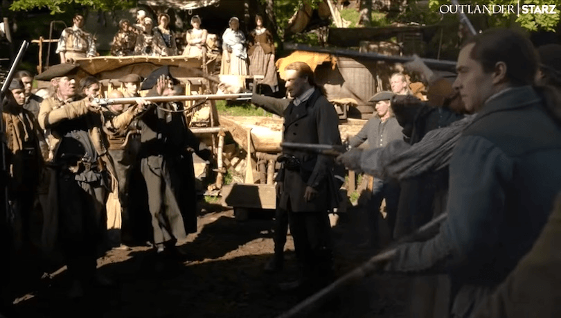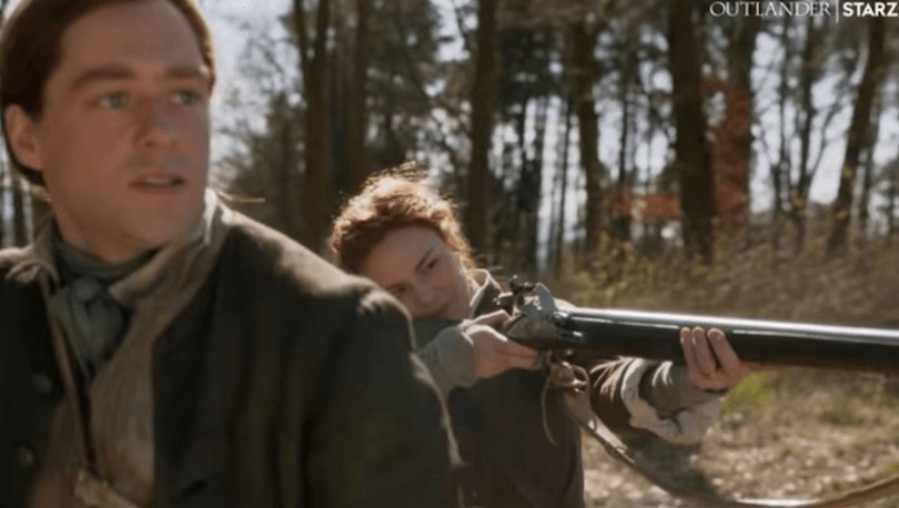 If you thought that now the Frasers were back together, and Brianna and Roger had their baby, and Murtagh and Jocasta were rutting like teenagers, that this would be a chilled out season where Jamie and Claire spent their days getting drunk on moonshine and making wild love in a field of strawberries, then I’m sorry. You’ll have to cosplay that sort of wild fanfiction in your own home, because this is sixty seconds of Jamie and Claire looking worried, of guns waved around willy nilly, of bad moods and bad tempers, and worst of all, Roger being a total downer about living in another time and place.