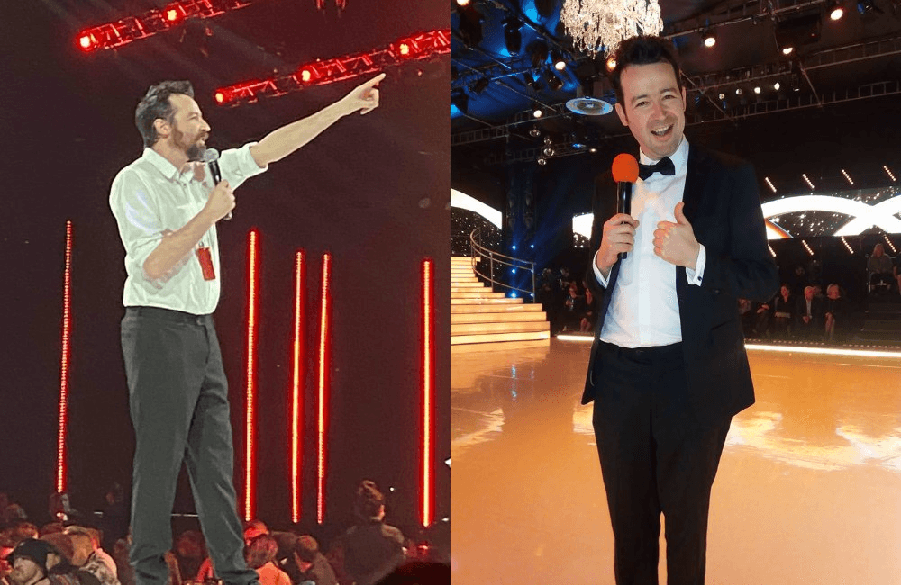 “Lots of other comedians hate doing it but I quite like it,” he says. He simplifies the role by treating it as a fireside discussion. “It’s just chatting with people.” He’ll often point in a random direction and ask something simple. “I always start with nice easy questions like, ‘What’s your name? What do you do?’ From that you get enough information to chat with them.”