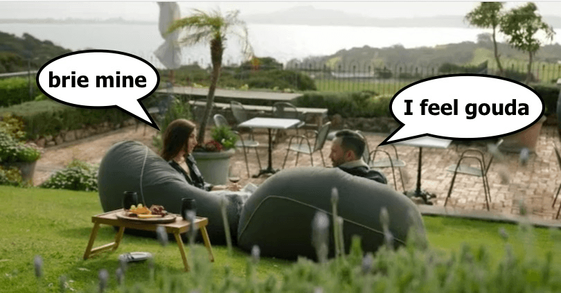 TW: I bloody loved the extreme cheese content on The Bachelorette NZ this week. The cheese platters upped their game (a single rose hidden among the brie and crackers — what is this, the future?), the bachelors dropped some cheesy lines (no, I’m lost in YOUR eyes), and Lexie and Hamish’s one-on-one date gave us one of the finest moments in New Zealand romantic history. They both like cheese! Let’s call this whole thing off, we have a winner.
