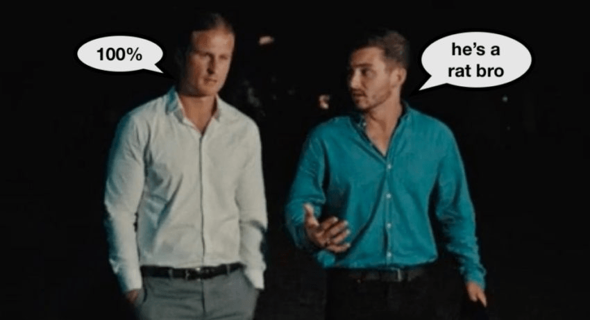 This week was the complete and utter undoing of AMOG, who revealed that the only thing stopping his head from completely exploding was his Hallensteins velveteen fedora. He narked on Liam to Lily, he then narked on himself for narking, and he paced around the courtyard having a normal one while chanting “it had to be me, it had to be me, it had to be me”.