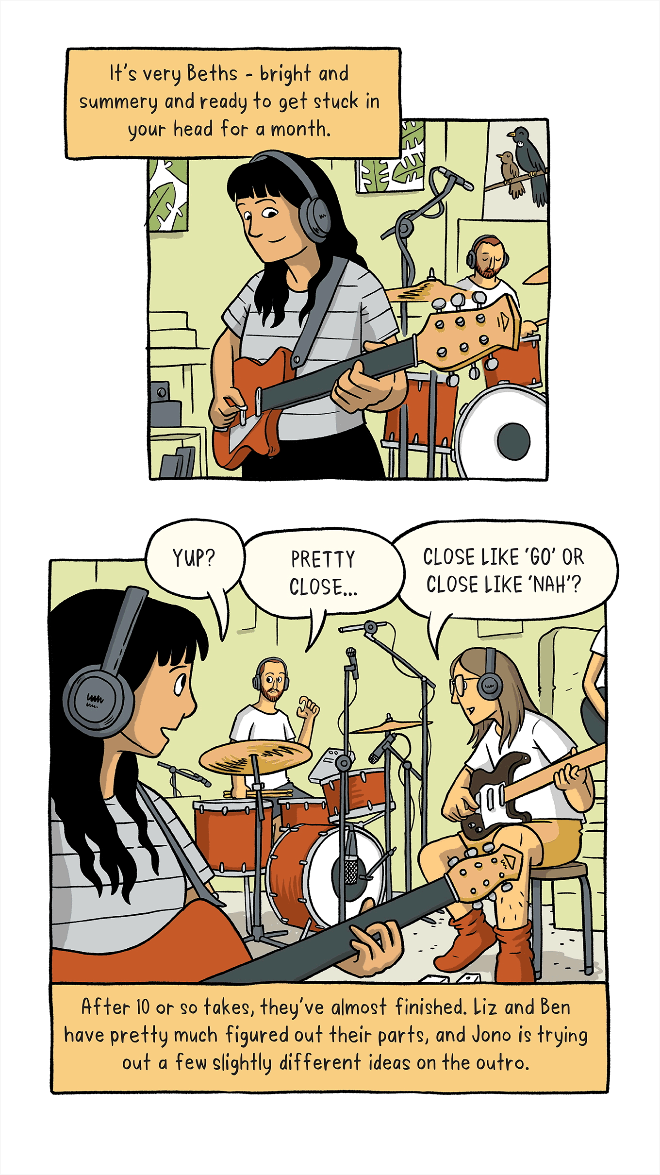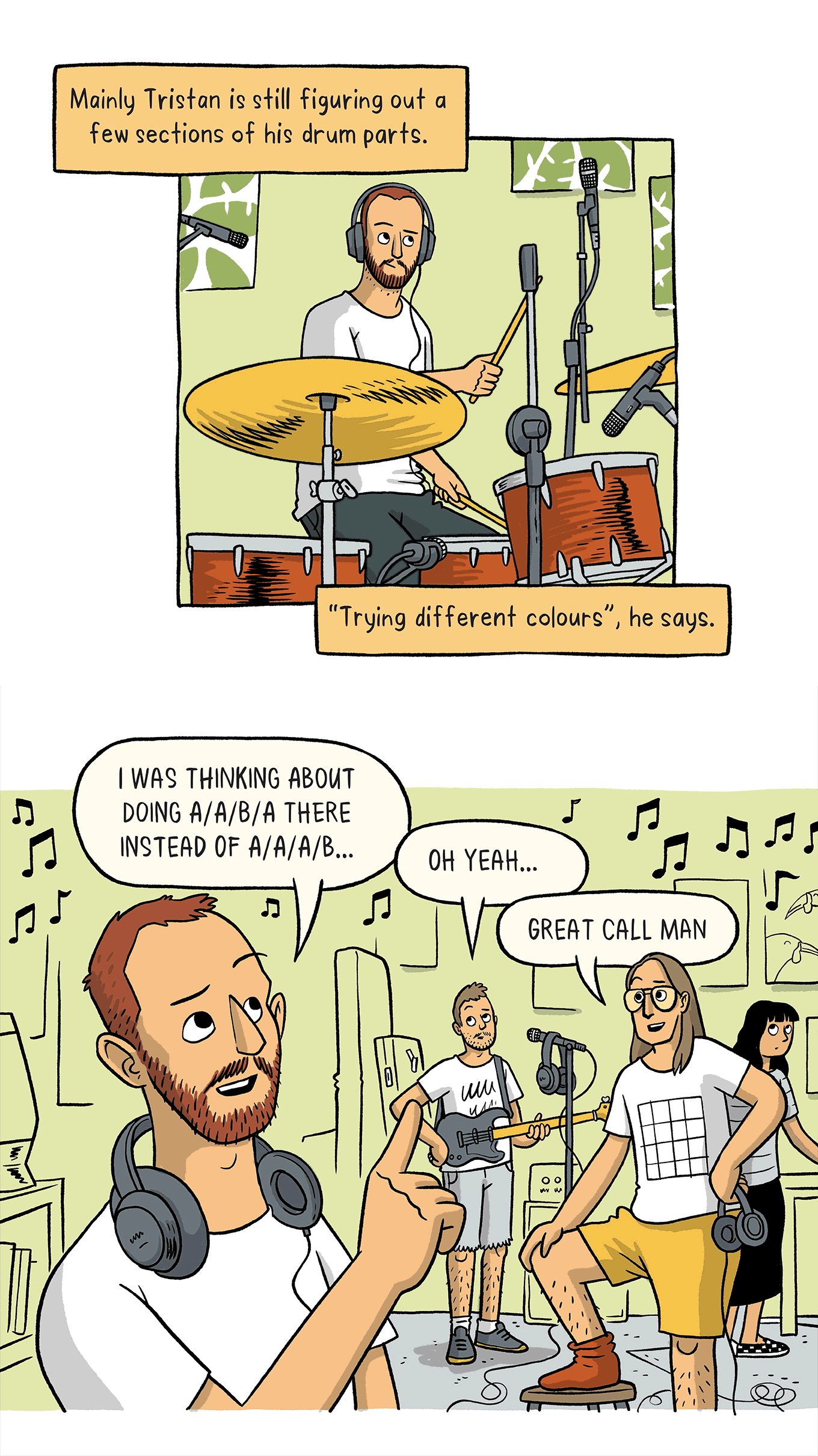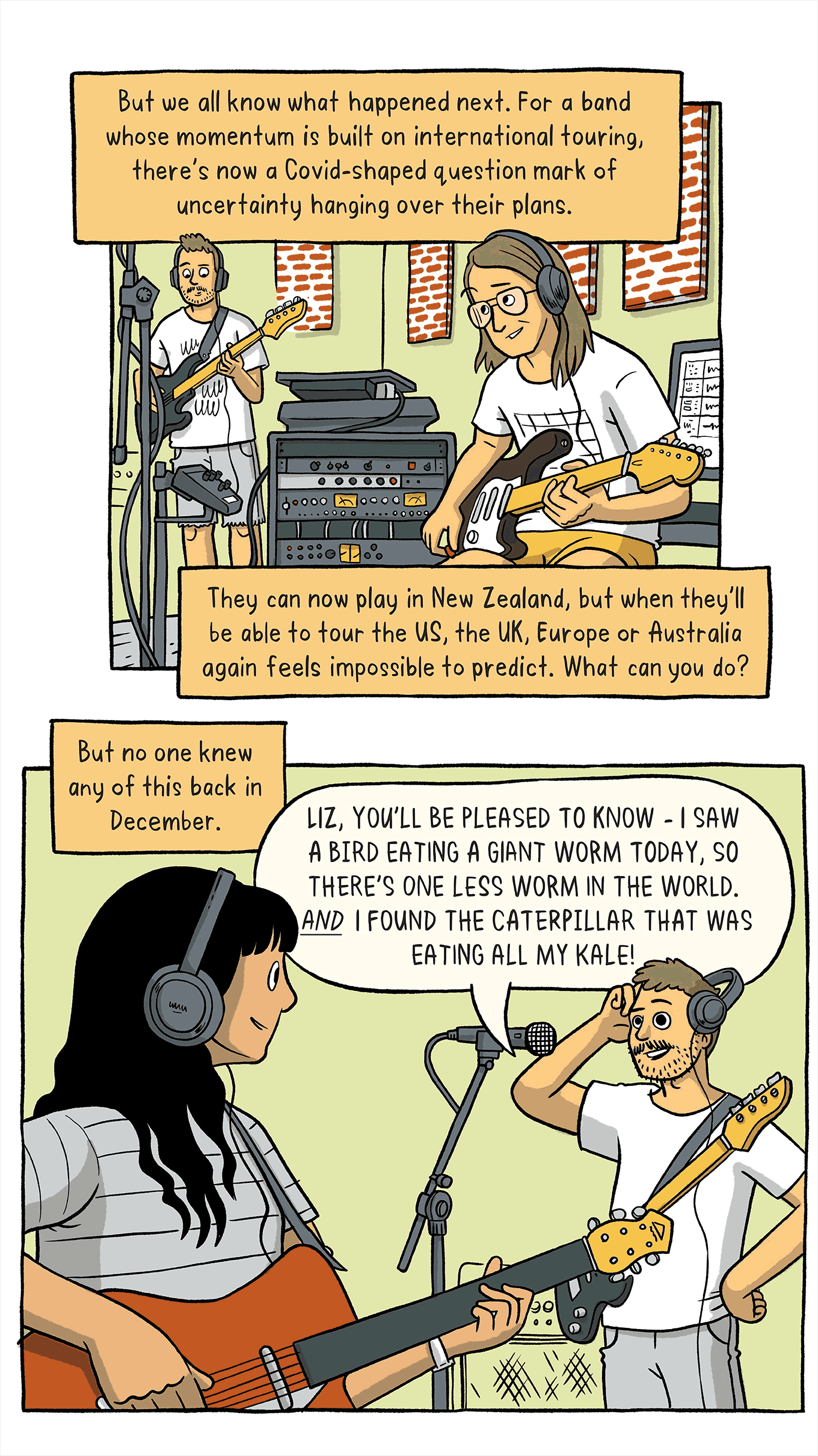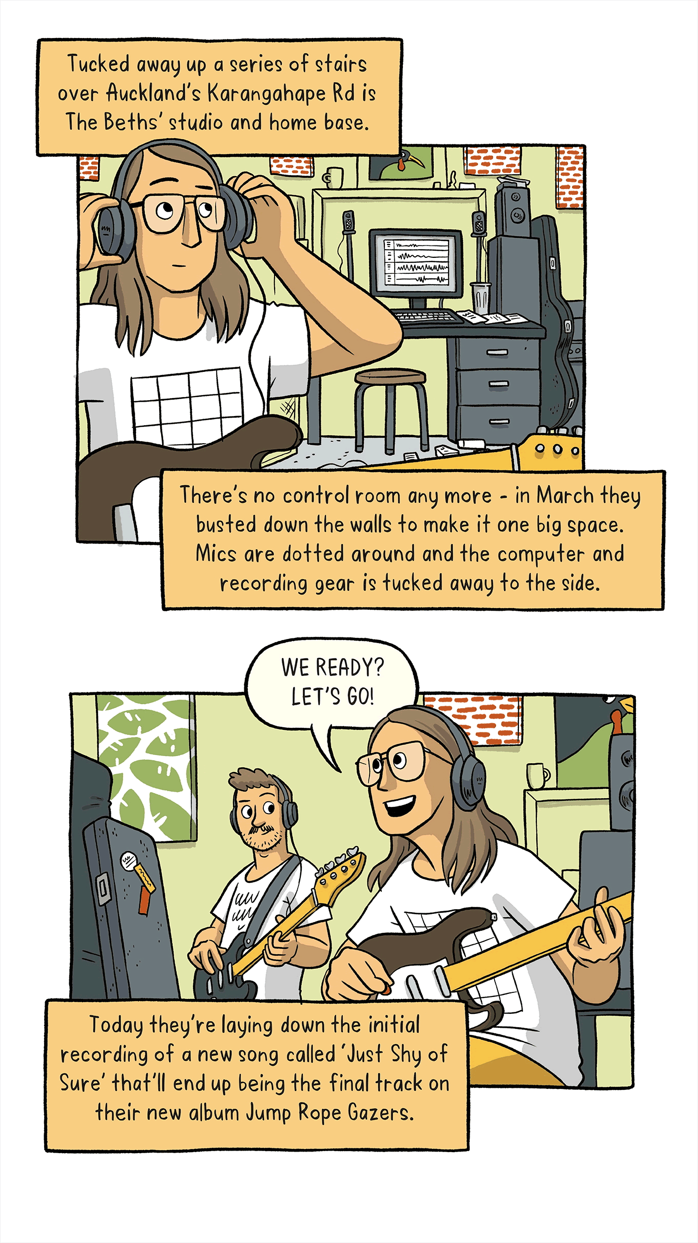 Cartoonist Toby Morris joins The Beths in the studio as they record ‘Just Shy of Sure’ off their 2020 album Jump Rope Gazers.