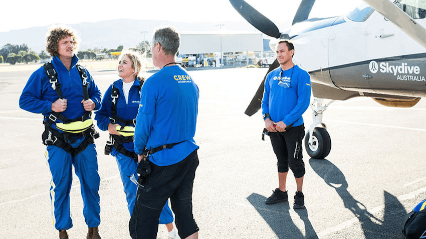 It’s an exceptionally windy day, which leaves much opportunity for mid-air leg clutching. Nick is screaming and Sophie is screaming as Nick leans out, ready to jump from the plane. The door comes down suddenly, and it is deemed too windy for them to jump.