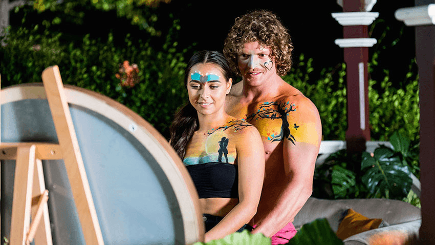 Brooke comes in to her date apprehensive. And so she should be, it’s the weirdest shit I have ever seen. They paint half of a scene on each other’s chest in the shelter of a Sound of Music-like gazebo. When they come together in the mirror, the chest paint forms an image of a silhouette of a couple under a fruit tree and I physically gag on the burrito I am eating.