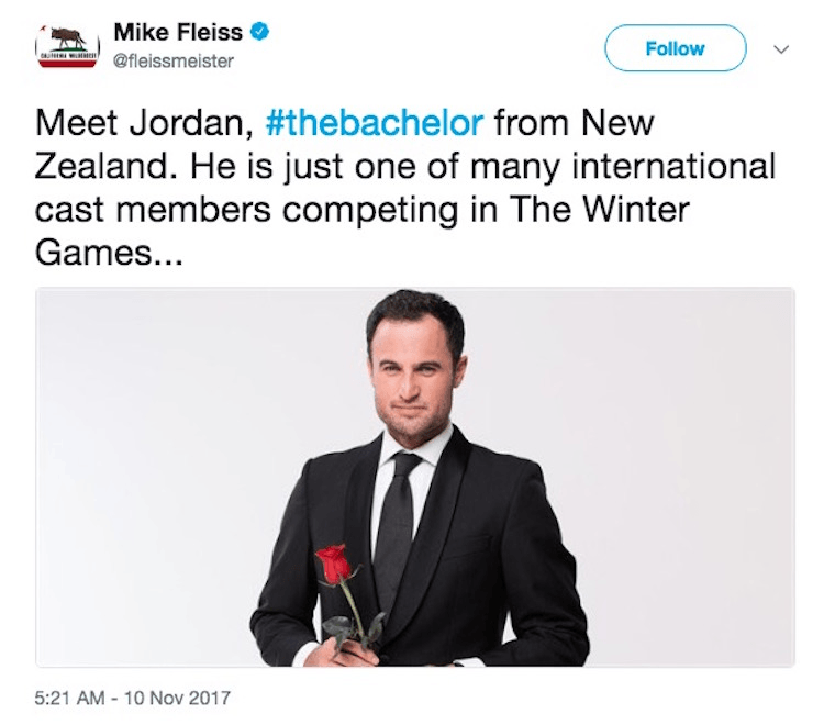 Mike Fleiss, US creator and producer of The Bachelor, confirmed Mauger’s participation in a tweet sent overnight. “Meet Jordan, #thebachelor from New Zealand,” he wrote, “He is just one of many international cast members competing in The Winter Games…”