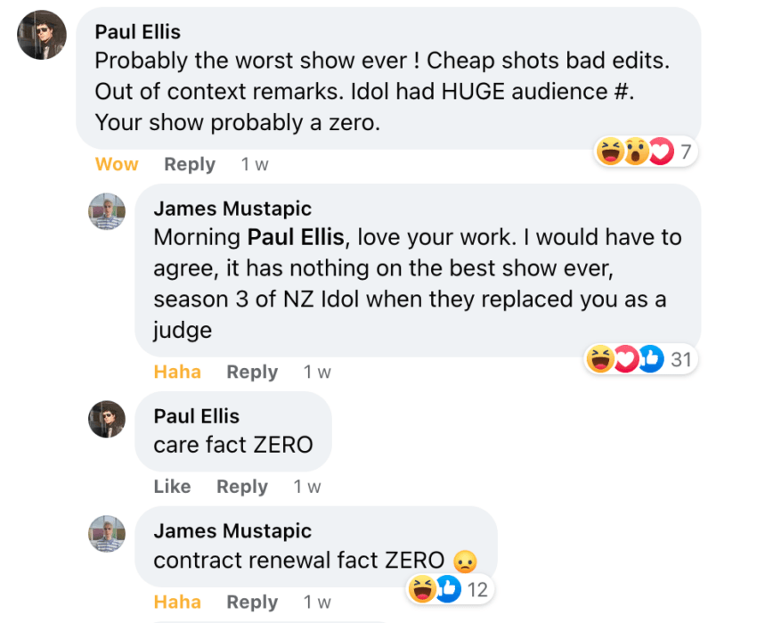 None of the guests who have appeared so far have got in touch to complain, he says, although former New Zealand Idol judge Paul Ellis wrote a disapproving comment on Facebook.
