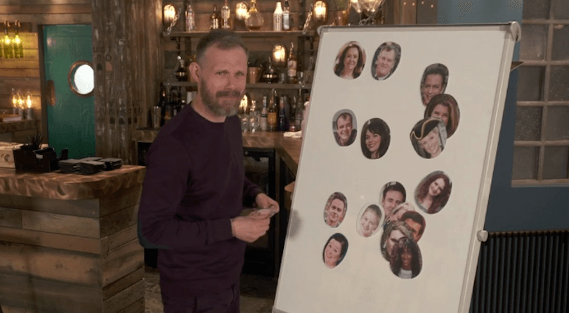 From Here to Now host Nick Tilsley (pretending to be a real person called Ben Price) talked us through 18 months of soap storylines in 8.4 nanoseconds by using the world’s most modern invention, the whiteboard. We can only assume the overhead projector had blown a bulb, so Nick Tilsley did God’s work as he took us by the hand and led us into a future filled with the decapitated faces of our precious Coro favourites.