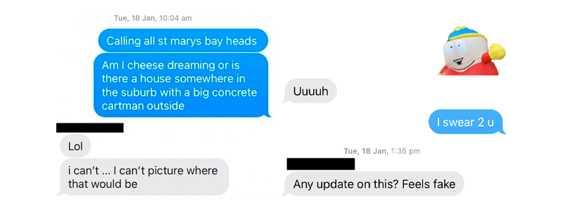 That single haunting image of Cartman plagued me for years. It didn’t make any sense. Why Cartman? Why St Mary’s Bay? Who made it? How? I could have sworn I took a selfie with him, but I couldn’t find evidence of it anywhere. I scoured old phones, hard drives, photo albums. Nothing. I asked friends, family, workmates, strangers.