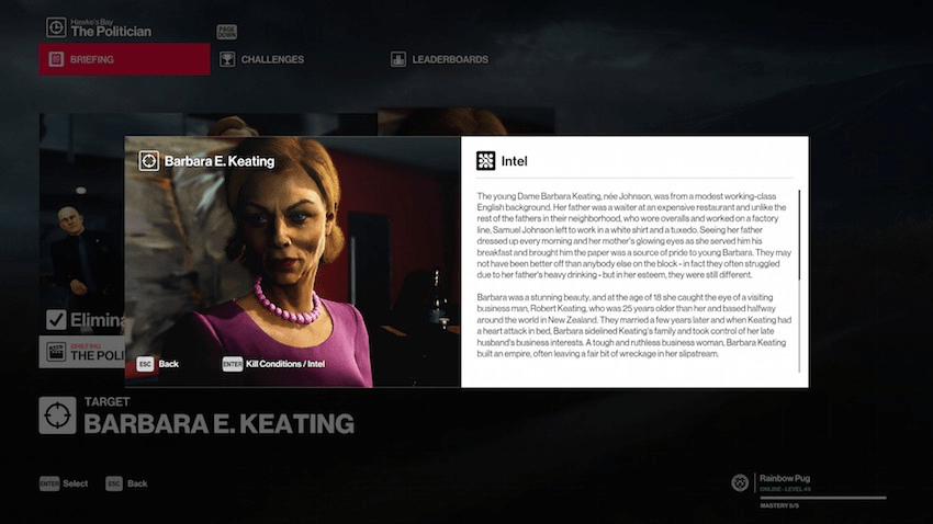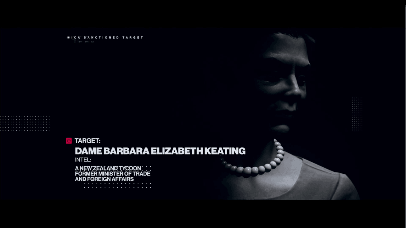 Elusive Targets are targets that appear in a destination for a limited period of time. You only get one shot, one opportunity to take each target down – if you miss, that’s it. You lose. And this week’s Elusive Target is a doozy for someone who loves New Zealand as much as me. The briefing video lays it all out: she’s a Kiwi (!!!) politician, a former Minister of Trade and Foreign Affairs who’s been exposed for siphoning money from a charity to her private offshore bank accounts. She’s covered it up by pinning it on the charity’s meek director, but she’s got blood on her hands: she had to have the director killed to keep her silent.