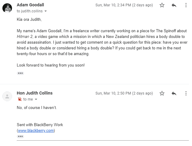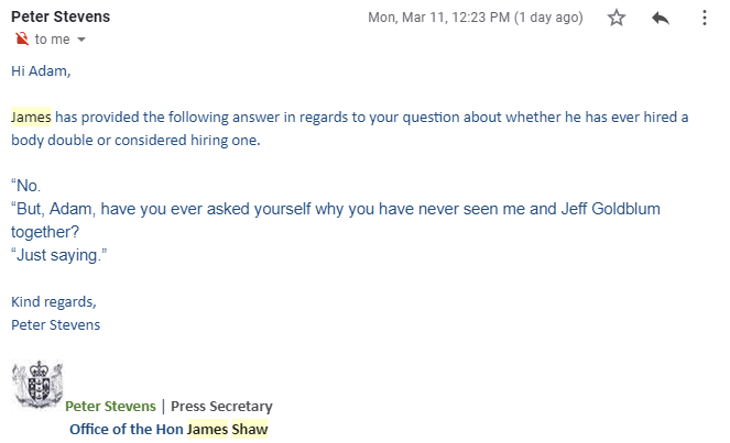 Maybe IO had uncovered the greatest political scandal in New Zealand history, something more scandalous than a thousand Oravidas, and this was the only way they could get the word out. I put on my little fedora with the piece of card that says ‘PRESS’ in the rim and I hit the footpath looking for answers, and by footpath I mean Gmail.