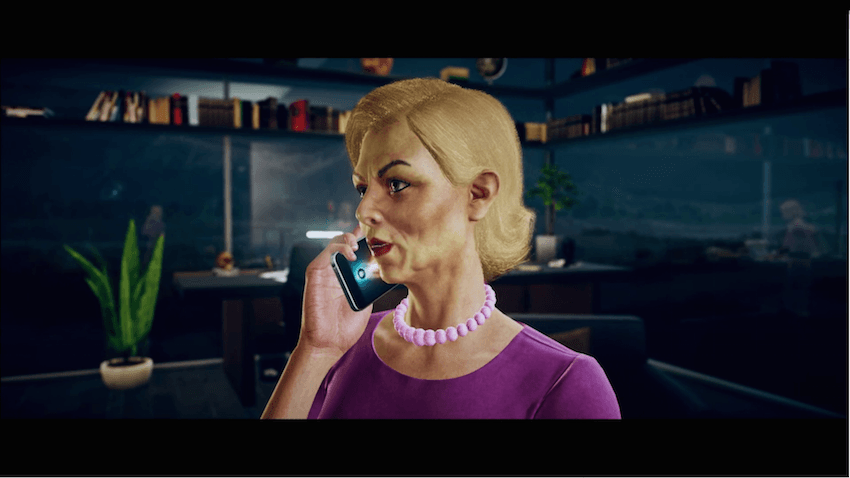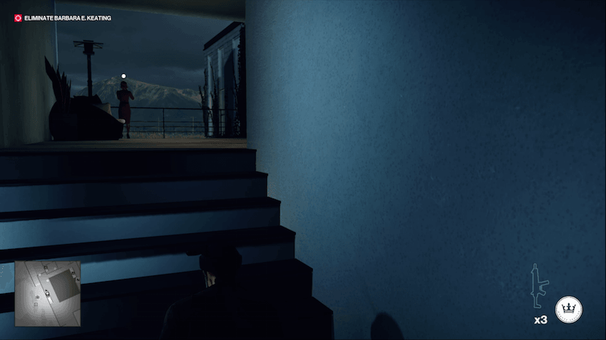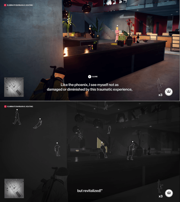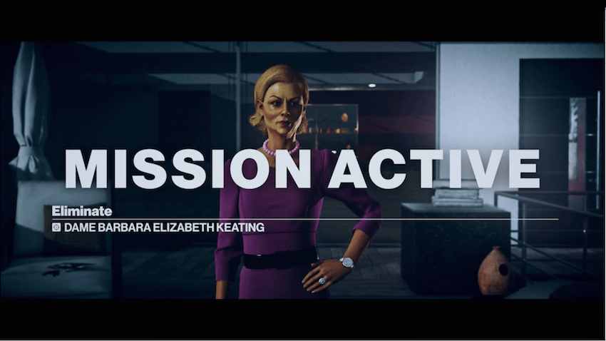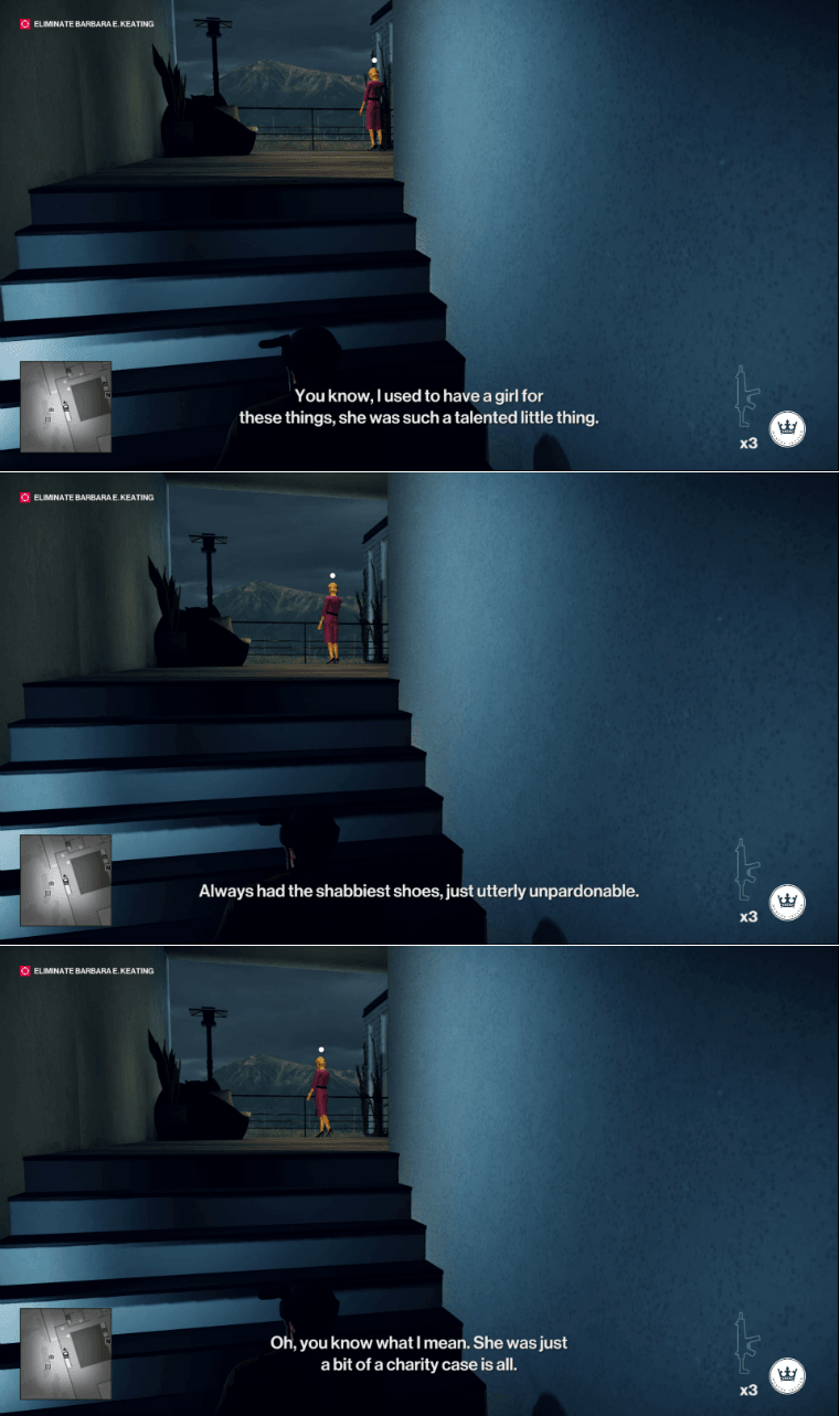 I drop into the mission, do a bit of recon – it’s important to do recon before you go after the Target so you know where everything is and how everyone moves – and eavesdrop in on some conversations. I listen in on Dame Keating’s body double practicing her – their – her comeback speech: