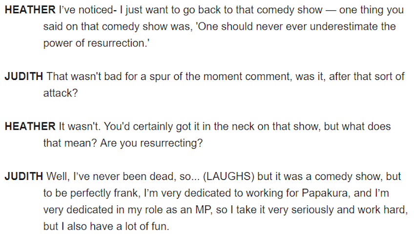 Do you know who else came back into the political sphere as though a mythological bird famed for its capacity for resurrection, talking about how she’d been revitalised by her setbacks? Then-former Minister of Justice, Police and Corrections ‘Crusher’ Collins, who told Heather du Plessis-Allan on Q&A in 2015, some time after her fall from grace: