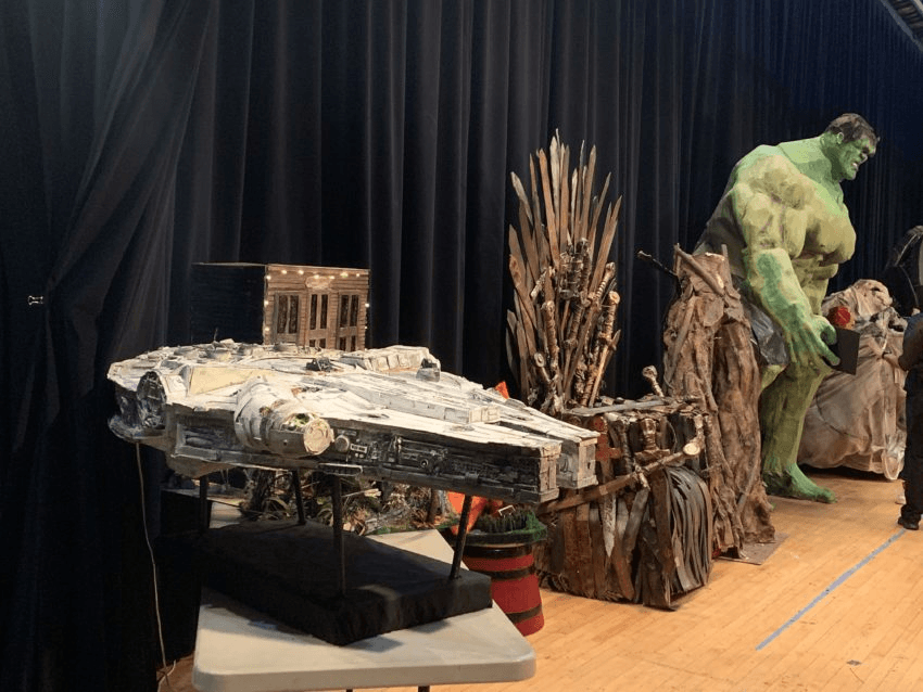 The top half of Groot, from their giant Avengers models, became part of the alien. Also pictured, a five-foot Millennium Falcon, and a full-size Iron Throne.