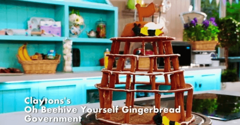 Anyone who whips up a conceptual piece of genius and names it ‘Oh Beehive Yourself’ is a winner in my eyes. Clayton built this brave biscuity masterpiece from three thousand tiny sticks of gingerbread, and it’s the sort of thing I’m happy to pay my taxes for. Two ticks, Clayton for PM, hive fives all round.