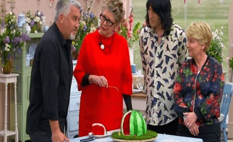 Of course, there are two new hosts — Sandi Toksvig and Noel Fielding — and a new judge, champion baker Prue Leith. Prue’s been baking for 50 years and promises to be firm but fair, much like an overbaked vanilla sponge. She begins by testing the bakers with a chocolate mini roll recipe that has basically no instructions. “Let’s just say, I have more difficult challenges to come,” she promises menacingly.